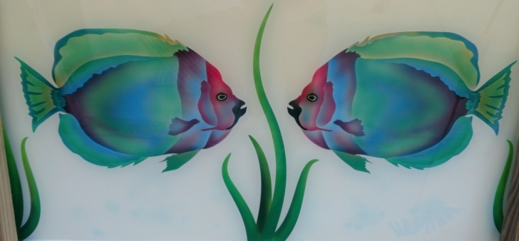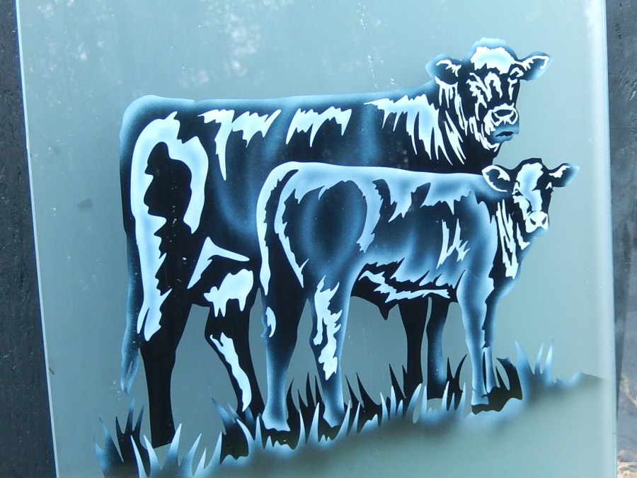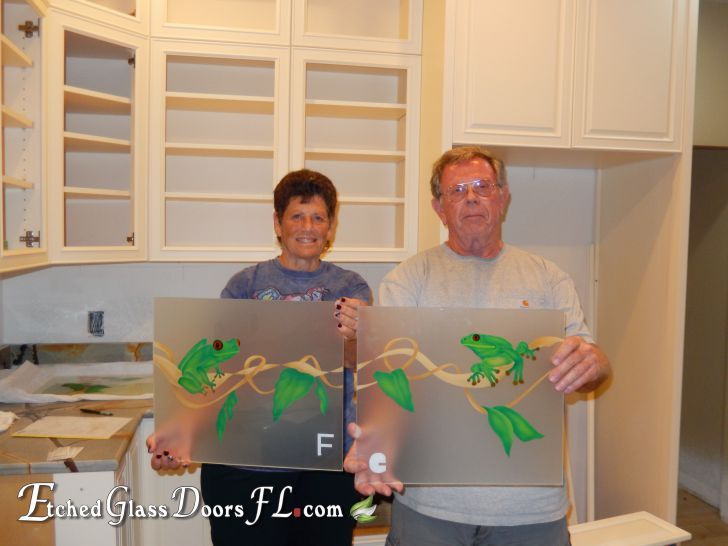 This is a much more involved process since it is a two step process.  It can be done on any of the 3 backgrounds, clear, acid etched, or enamelled.  It is best to use this in lower traffic areas where it is less likely to be touched.  It does take more care.  The etched area with the color on interior doors must stay at least 1 inch away from the edge of the glass so your painter can tape the glass area off with non inked paper prior to painting. You cannot let the tape touch the colored areas.