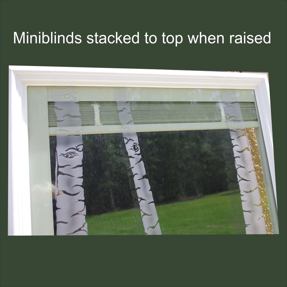 Door inserts have an airspace between the inner and outer layer of glass. This is true of standard and also the hurricane impact inserts. The miniblinds are between these layers. So no dust! yeah! This post is illustrating to you the stacking height at the top of the door when raised. Yes, it does obscure a bit of view when raised but that is the only way to have both visibility when you want it and closed for privacy when you want that. Usually people that live on bigger more rural properties are interested in this option. Sometimes the bedrooms to a pool lanai are a space where this option is used also.