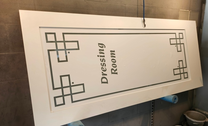 This interior door will be used as a barn door since it is not prehung into a frame. The frosted background gives the customer full privacy. The etched design is applied to the exterior side which allows the design to have the most contrast with the shiny unetched surface. This is how all my interior privacy doors are done.